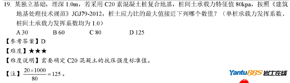 同問(0)已回答為什么要用立方體抗壓強度?20X1000/80=125這是2016年的李向陽和郭嘉給出的答案,是認為樁和土同時達到最大應力來考慮的。